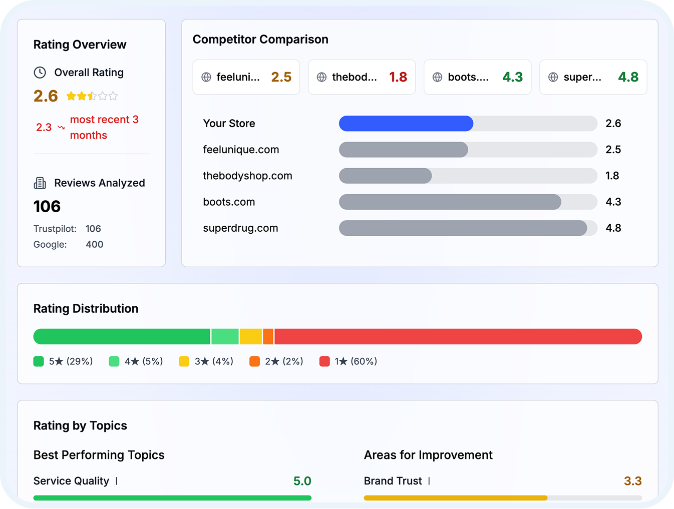 Analyze your Google and Trustpilot reviews with AI-driven sentiment analysis. See exactly how customers talk about your brand versus competitors — from product quality and pricing to delivery and support. With clear benchmarks, you’ll spot strengths to amplify and pain points to address, helping you build trust and win more loyal buyers.